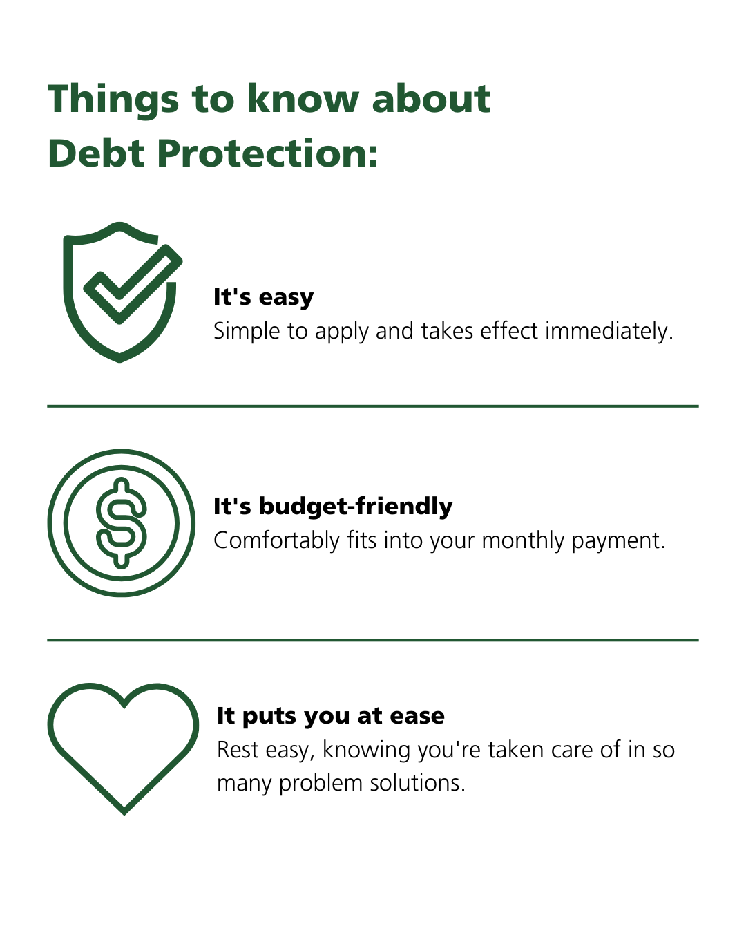 *Debt Protection with Life Plus is optional and will not affect your application for credit or the terms of any credit agreement required to obtain a loan. Certain eligibility requirements, conditions and exclusions may apply. Please contact your loan representative, or refer to the contract for a full explanation of the terms. You will receive the contract before you are required to pay for Debt Protection with Life Plus. You may cancel the protection at any time. If you cancel protection withing 30 days, you will receive a full refund of any fee paid.